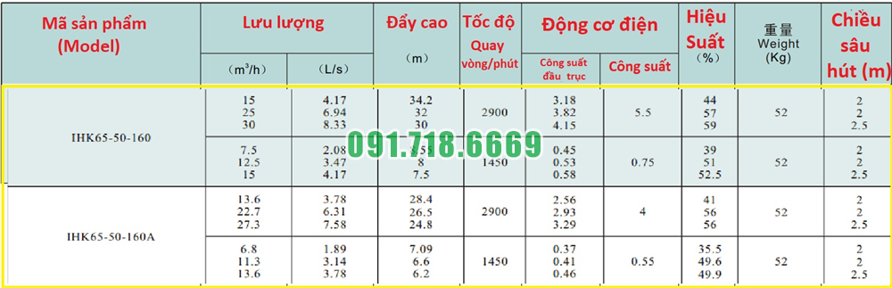 Model IHK65-50-160: Đây là mã số của máy bơm, mô tả các thông số kỹ thuật cụ thể như đường kính vào (65mm), đường kính ra (50mm), và đường kính trục (160mm). Các thông số này quyết định khả năng hoạt động và hiệu suất của máy bơm.