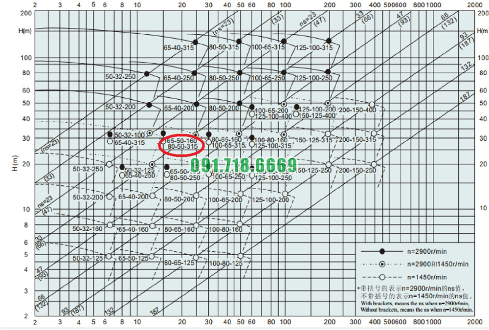 Đường cong hiệu suất của bơm li tâm cánh hở lưu lượng 30 m3/h model IHK65-50-160