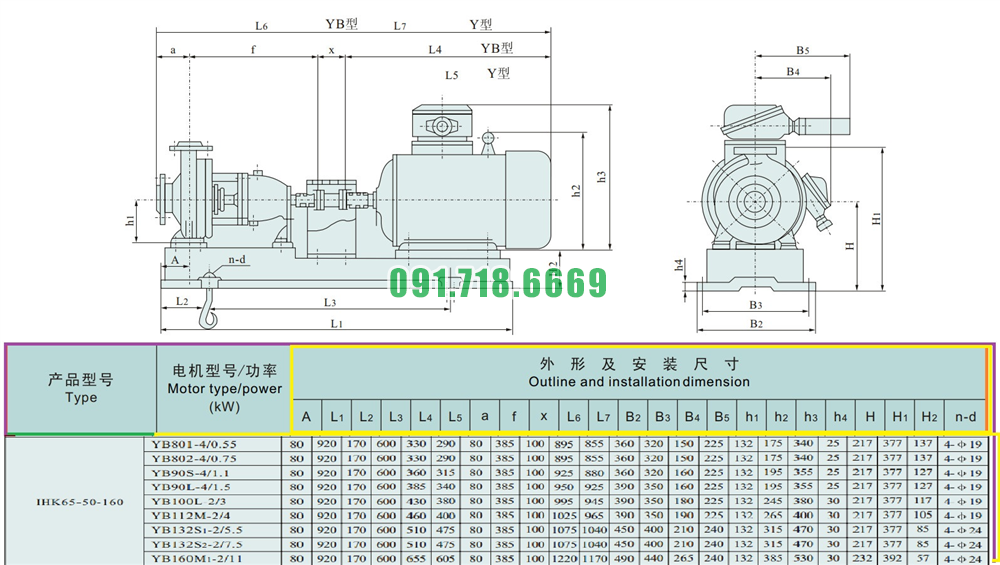Kích thước lắp đặt của bơm li tâm cánh hở lưu lượng 30 m3/h model IHK65-50-160
