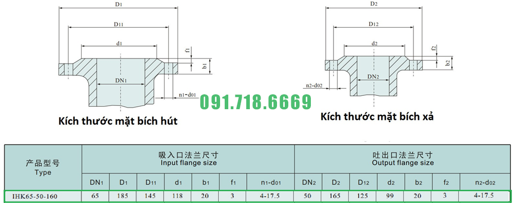 Kích thước mặt bích của bơm li tâm cánh hở lưu lượng 30 m3/h model IHK65-50-160