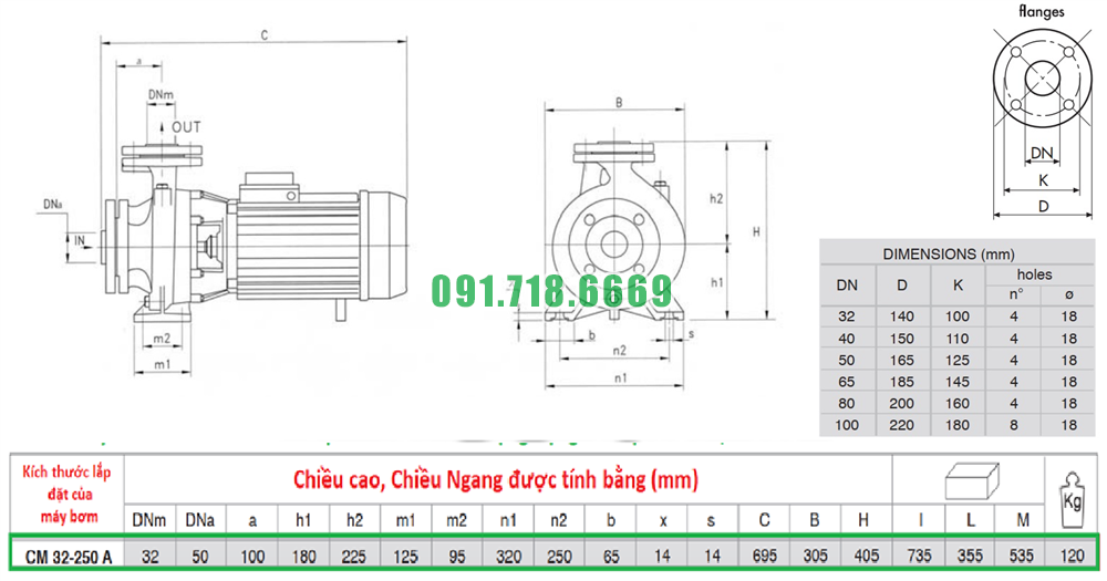 Kích thước bơm li tâm trục ngang công suất 15 kw model CM32-250A