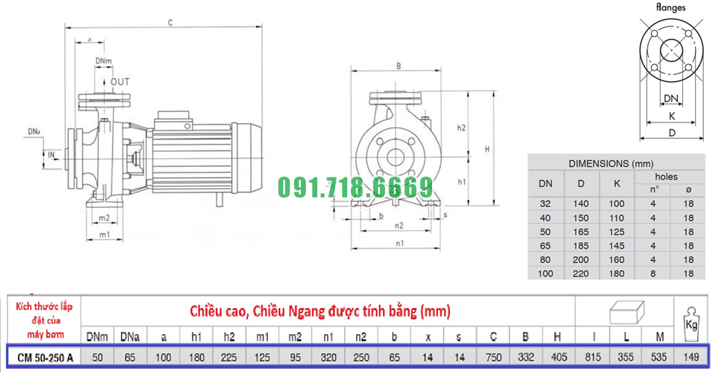 Kích thước bơm li tâm trục ngang công suất 22 kw model CM50-250A