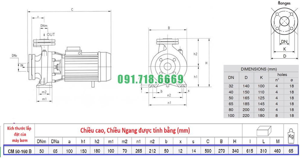| CM50 - 160B | 78 m3 / h | 30 m | 5.5 kw | 380 v | Dn65 / 40 mm | Vỏ gang FC200