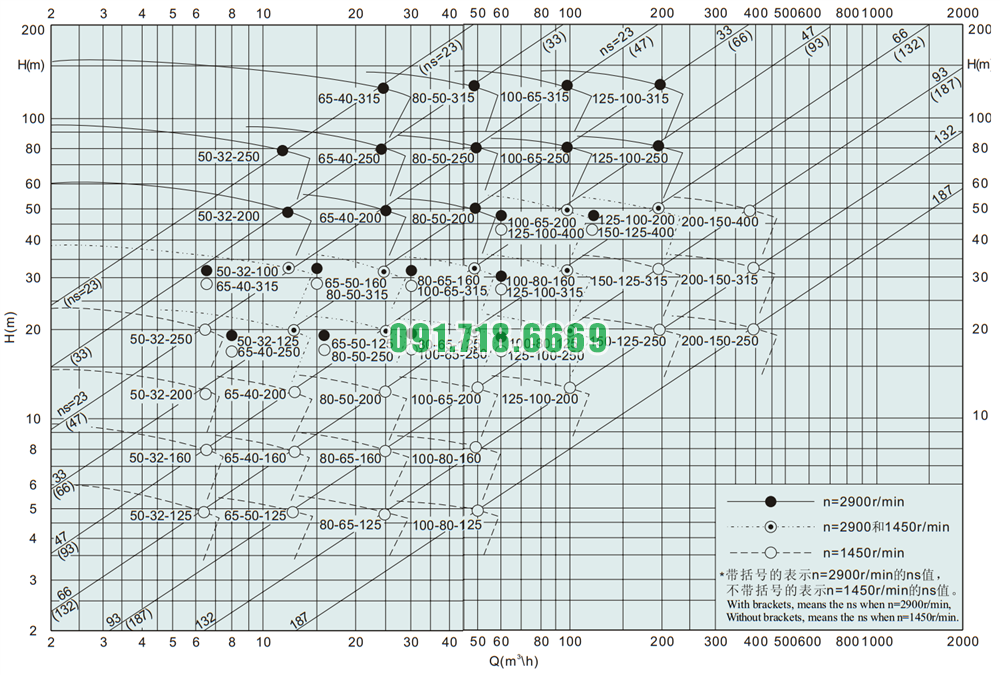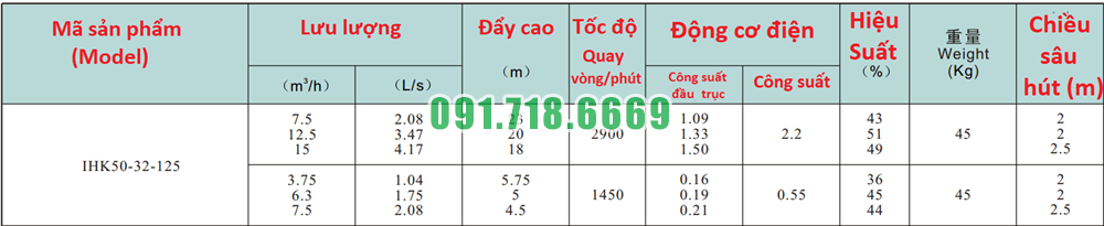 Bảng thông số lưu lượng của máy bơm cánh hở li tâm trục ngang IHK50-32-125 lưu lượng 15 m3/h