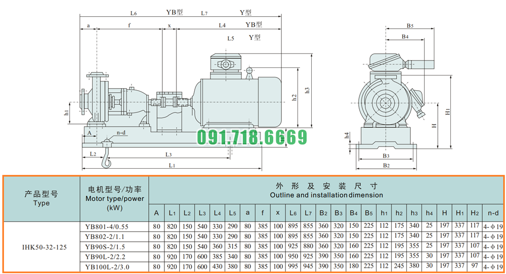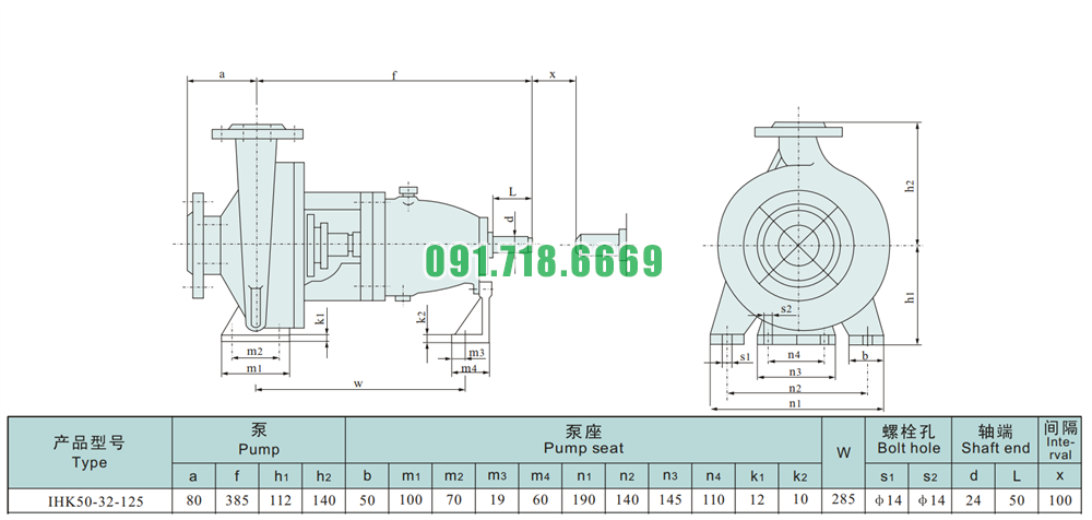 Kích thước lắp đặt của đầu bơm máy bơm cánh hở li tâm trục ngang IHK50-32-125 lưu lượng 15 m3/h