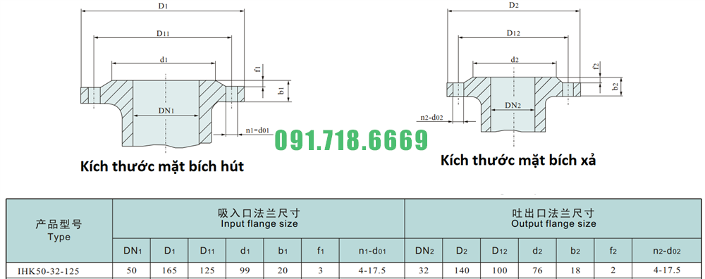 Kích thước mặt bích kết nối hút xả của máy bơm cánh hở li tâm trục ngang IHK50-32-125 lưu lượng 15 m3/h