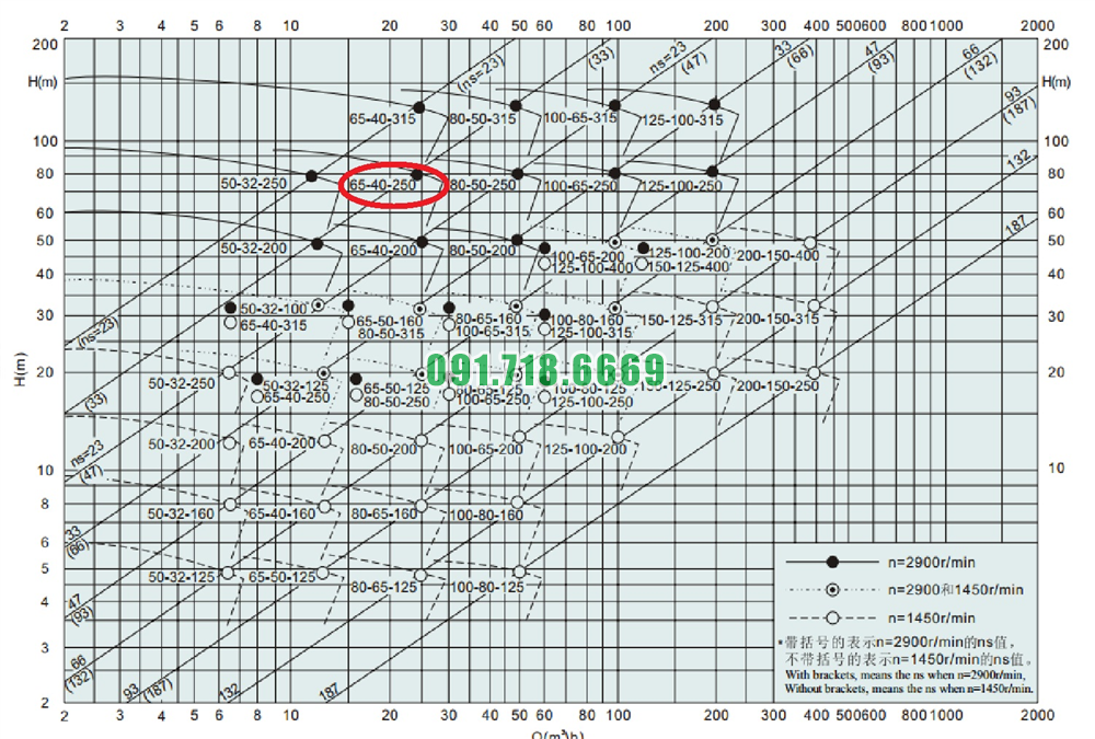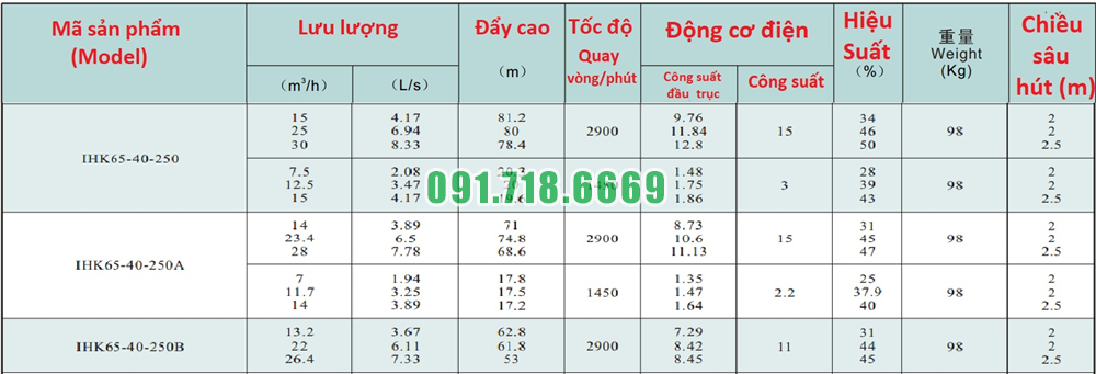 Bảng lưu lượng của máy bơm cánh hở li tâm trục ngang IHK65-40-250 lưu lượng 30 m3/h