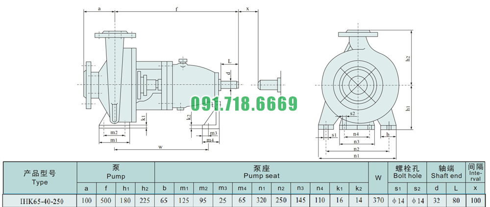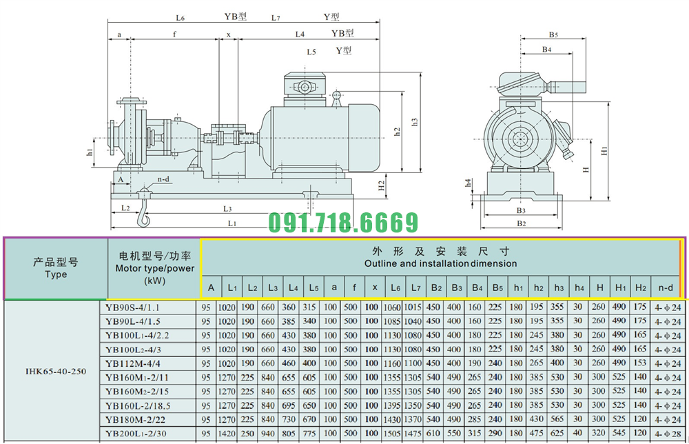 Kích thước của đầu máy bơm cánh hở li tâm trục ngang IHK65-40-250 lưu lượng 30 m3/h