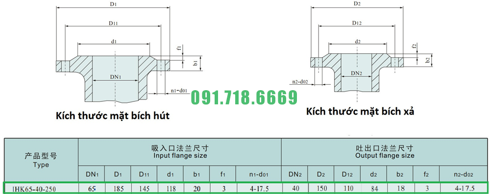 Kích thước mặt bích của máy bơm cánh hở li tâm trục ngang IHK65-40-250 lưu lượng 30 m3/h