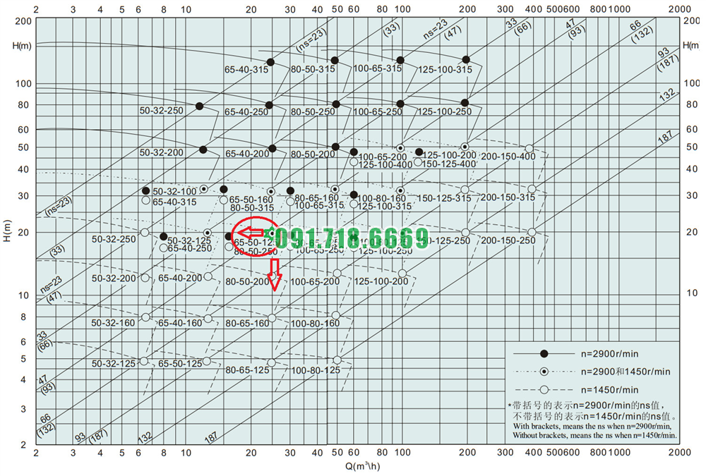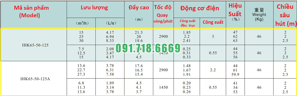 Bảng lưu lượng của máy bơm cánh hở li tâm trục ngang IHK65-50-125 lưu lượng 30 m3/h