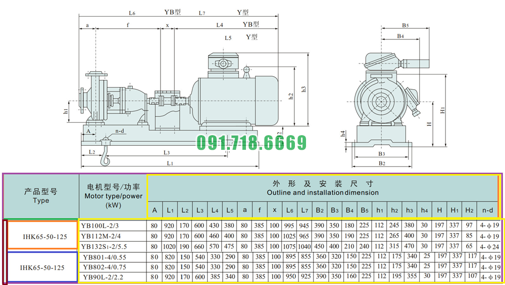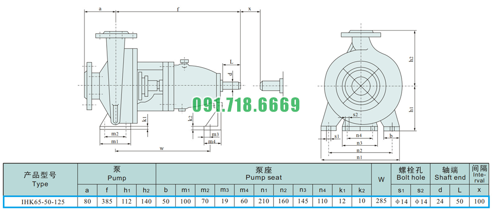 Kích thước của đầu máy bơm cánh hở li tâm trục ngang IHK65-50-125 lưu lượng 30 m3/h