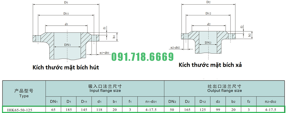 Kích thước mặt bích của máy bơm cánh hở li tâm trục ngang IHK65-50-125 lưu lượng 30 m3/h