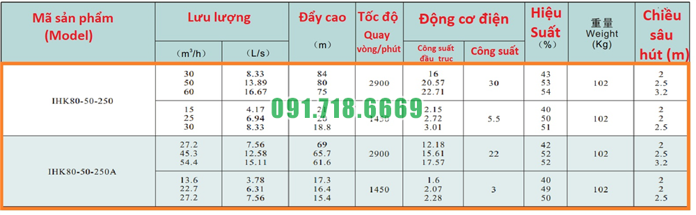 Bảng lưu lượng của máy bơm cánh hở li tâm trục ngang IHK80-50-250 lưu lượng 13-60 m3/h