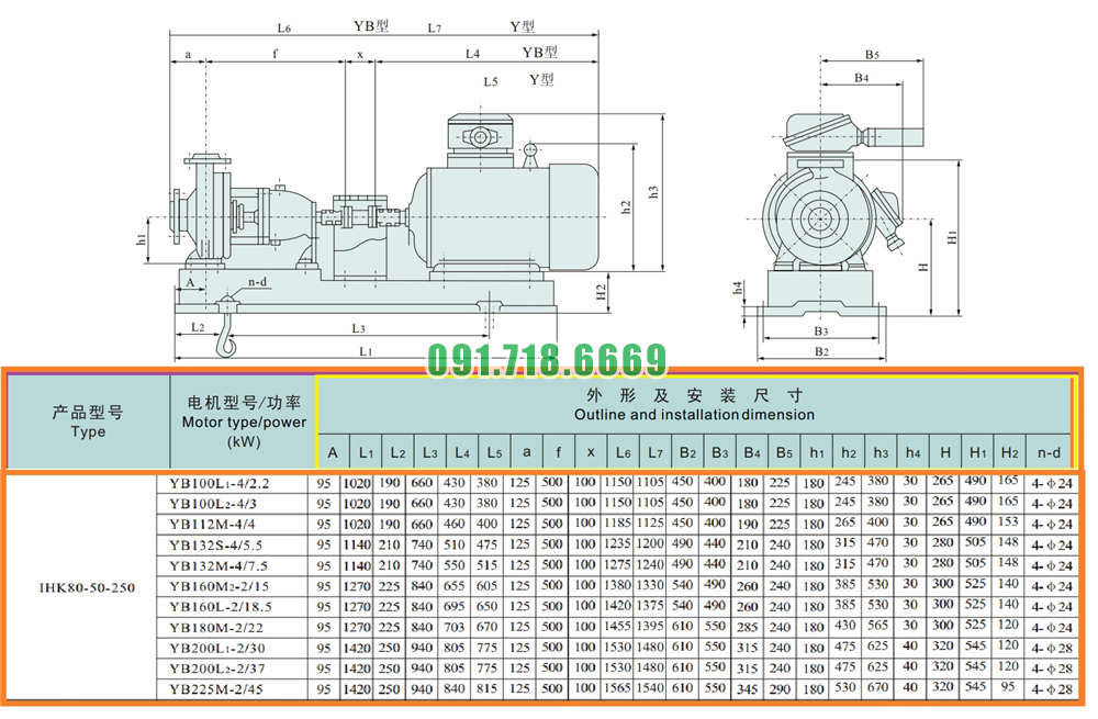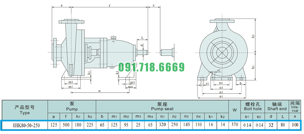 Kích thước của đầu máy bơm cánh hở li tâm trục ngang IHK80-50-250 lưu lượng 13-60 m3/h