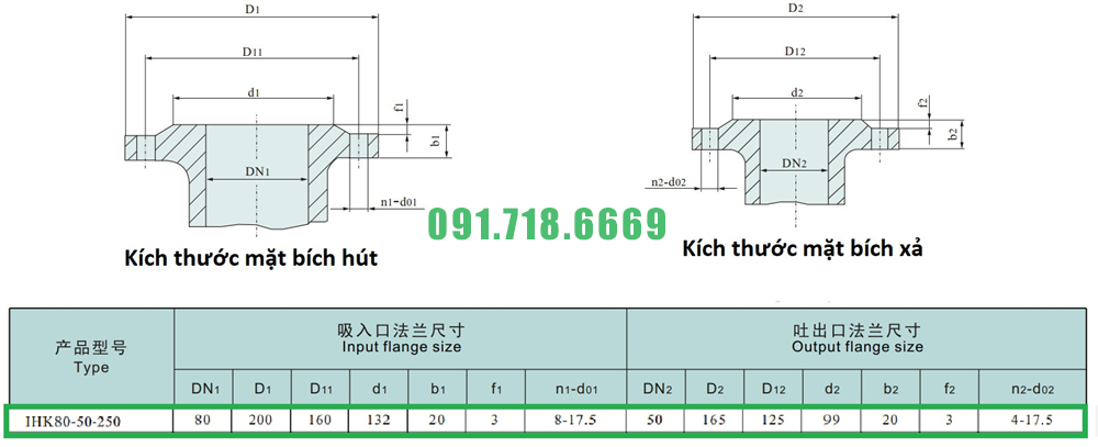 Kích thước mặt bích của máy bơm cánh hở li tâm trục ngang IHK80-50-250 lưu lượng 13-60 m3/h