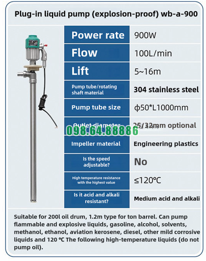 Sự tỉ mỉ trong từng chi tiết cơ khí của Máy bơm chất lỏng inox 304 chống cháy nổ WB-A-900 còn thể hiện ở việc lựa chọn vật liệu inox 304 có độ bền cao, phù hợp với môi trường hóa chất.