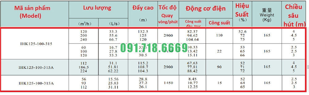Bảng lưu lượng của máy bơm nước li tâm trục ngang cánh hở IHK125-100-315 có điện áp 380v
