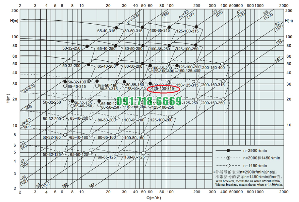 Đường cong hiệu suất của máy bơm nước li tâm trục ngang cánh hở IHK125-100-315 có điện áp 380v