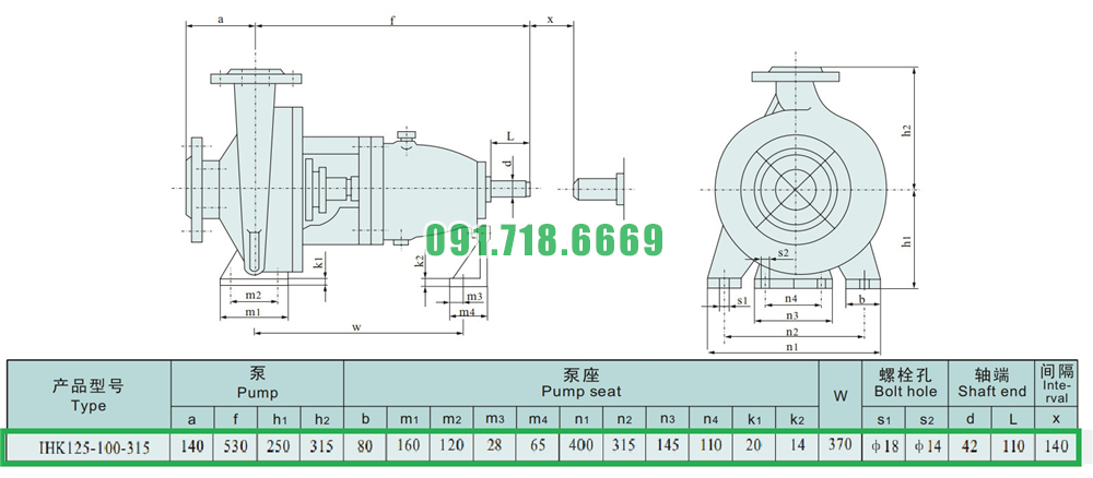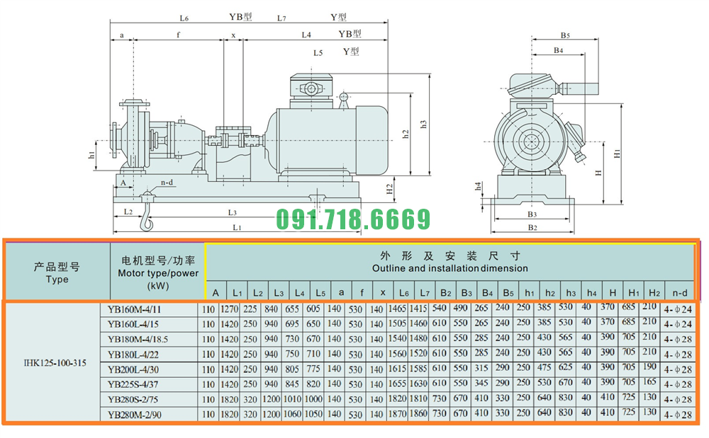 Kích thước của đầu máy bơm nước li tâm trục ngang cánh hở IHK125-100-315 có điện áp 380v