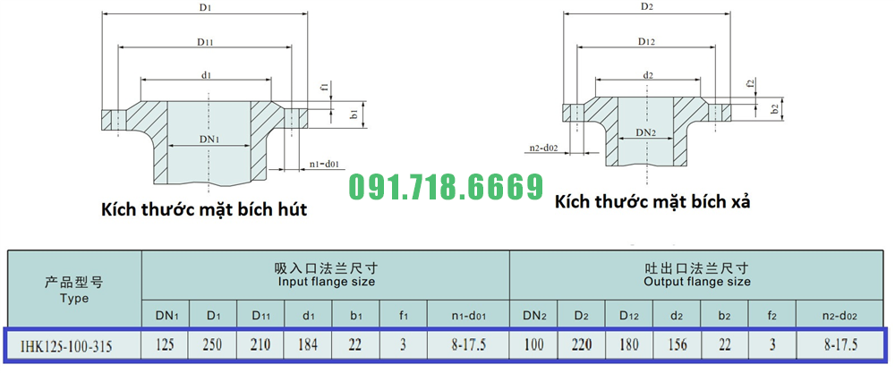 Kích thước mặt bích của máy bơm nước li tâm trục ngang cánh hở IHK125-100-315 có điện áp 380v