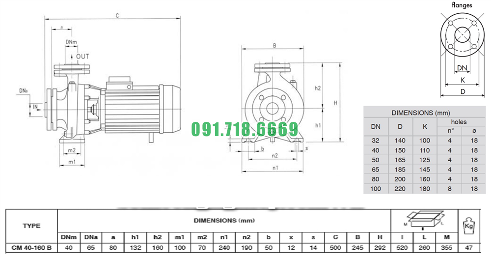 Kích thước máy bơm nước li tâm trục ngang CM40-160B công suất 3 kw