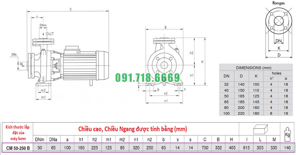 Kích thước máy bơm nước li tâm trục ngang CM50-250B lưu lượng 78 m3/h