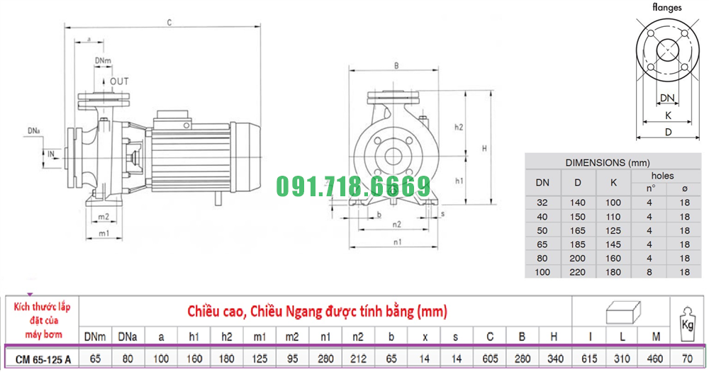 Kích thước máy bơm nước li tâm trục ngang CM65-125A lưu lượng 132 m3/h