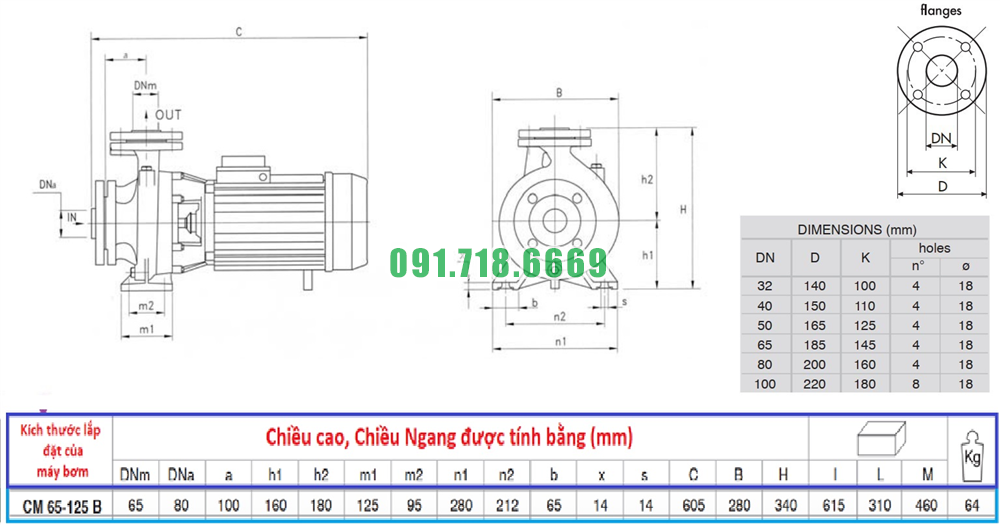 | CM65 - 125B | 120 m3 / h | 21 m | 5.5 kw | 380 v | Dn65 / 40 mm | Vỏ gang FC200