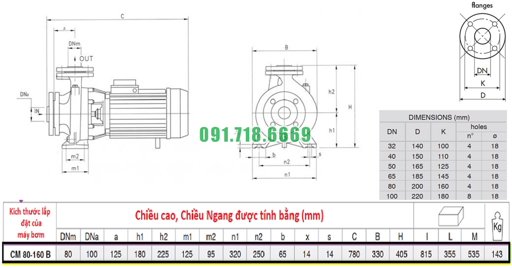 Kích thước máy bơm nước li tâm trục ngang CM80-160B lưu lượng 210 m3/h