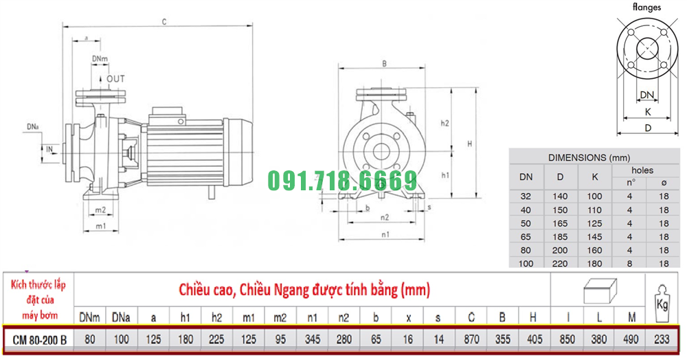 Kích thước máy bơm nước li tâm trục ngang CM80-200B lưu lượng 225 m3/h